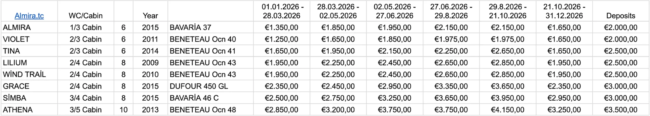 Not Included in the Price: Food, transportation expenses (Fethiye, Ece Marina round trip/return), Final cleaning of the boat, Fuel, Transit LOG Personal protective equipment